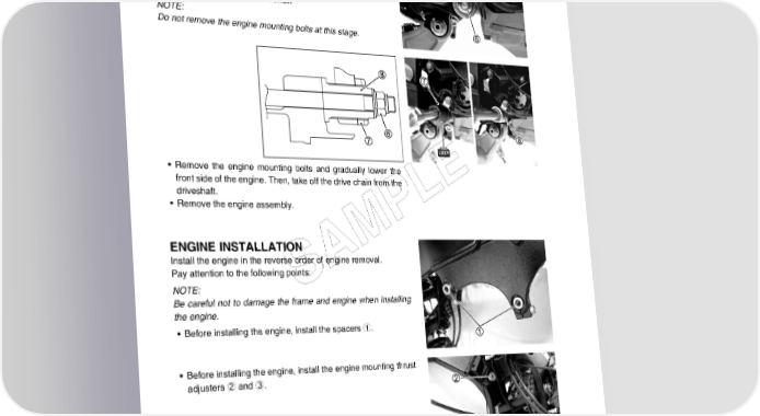 3-10 ENGINE • Remove the engine mounting nut 6. • Loosen the engine mounting thrust adjuster lock-nut 7 with the special tool. • Loosen the engine mounting thrust adjuster 8. 09940-14990: Engine mounting thrust adjuster socket wrench NOTE: Do not remove the engine mounting bolts at this stage. • Remove the engine mounting bolts and gradually lower the front side of the engine. Then, take off the drive chain from the E driveshaft. L • Remove the engine assembly. P ENGINE INSTALLATION M Install the engine in the reverse order of engine removal. Pay attention to the following points: A NOTE: S Be careful not to damage the frame and engine when installing the engine. • Before installing the engine, install the spacers 1. • Before installing the engine, install the engine mounting thrust adjusters 2 and 3.