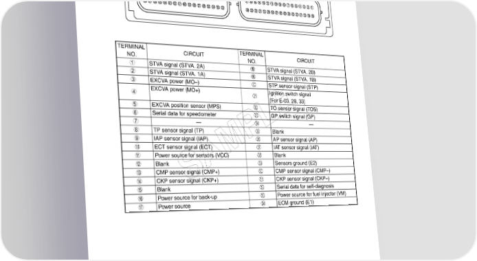 FI SYSTEM DIAGNOSIS 4-15 ECM TERMINAL TERMINAL CIRCUIT TERMINAL CIRCUIT NO. NO. 1 STVA signal (STVA. 2A) H STVA signal (STVA. 2B) 2 STVA signal (STVA. 1A) I STVA signal (STVA. 1B) 3 EXCVA power (MO–) J STP sensor signal (STP) 4 EXCVA power (MO+) K Ignition switch signal [For E-03, 28, 33] 5 EXCVA position sensor (MPS) L TO sensor signal (TOS) E 6 Serial data for speedometer M GP switch signal (GP) 7 — N L — 8 TP sensor signal (TP) O Blank P 9 IAP sensor signal (IAP) P AP sensor signal (AP) 0 ECT sensor signal (ECT) MQ IAT sensor signal (IAT) A Power source for sensors (VCC) R Blank B Blank A S Sensors ground (E2) C CMP sensor signal (CMP+) T CMP sensor signal (CMP–) S D CKP sensor signal (CKP+) U CKP sensor signal (CKP–) E Blank V Serial data for self-diagnosis F Power source for back-up W Power source for fuel injector (VM) G Power source X ECM ground (E1)