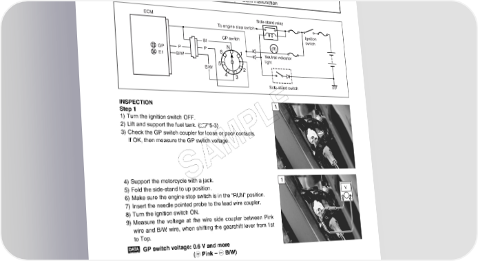 FI SYSTEM DIAGNOSIS 4-73 “C31” (P0705) GP SWITCH CIRCUIT MALFUNCTION DETECTED CONDITION POSSIBLE CAUSE No Gear Position switch voltage • Gear Position switch circuit open or short Switch voltage is not within the following range. • Gear Position switch malfunction Switch voltage > 0.6 V • ECM malfunction ECM Side-stand relay To engine stop switch Ignition GP switch switch BI GP P P N E1 B/W 6 1 Neutral indicator 5 light B/W 2 4 3 Side-stand switch INSPECTION 1 Step 1 E 1) Turn the ignition switch OFF. 2) Lift and support the fuel tank. (5-3) L 3) Check the GP switch coupler for loose or poor contacts. If OK, then measure the GP switch voltage. P SAM 4) Support the motorcycle with a jack. 1 5) Fold the side-stand to up position. V 6) Make sure the engine stop switch is in the “RUN” position. 7) Insert the needle pointed probe to the lead wire coupler. 8) Turn the ignition switch ON. 9) Measure the voltage at the wire side coupler between Pink wire and B/W wire, when shifting the gearshift lever from 1st to Top. GP switch voltage:0.6 V and more (+ Pink – - B/W) 09900-25008: Multi-circuit tester set 09900-25009: Needle pointed probe set Tester knob indication: Voltage ()