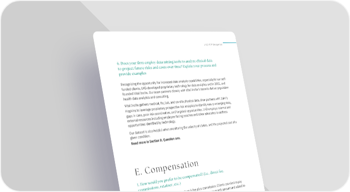 PAGE 19 LHD RFP Response 1. How would you prefer to be compensated? (i.e., direct fee, commissions, retainer, etc.) 2. Does your firm accept contingent commission payments or bonuses from insurers with which you place business? 6. Does your firm employ data mining tools to analyze clinical data to project future risks and costs over time? Explain your process and provide examples LHD’s proposed compensation structure is fee plus commission. Clients can elect to pay monthly fees directly to LHD or convert to a per employee per month amount and added to carrier charges with the carrier(s) remitting payment to LHD. Within the scope of our transparent compensation model, we accept and report contingent commissions / bonuses when they are a standard part of a carrier program. We do not manage a carrier panel limiting access to carriers that pay contingent commissions. We do not negotiate for contingent commissions / bonuses, and we do not position our block of business to maximize them. Recognizing the opportunity for increased data analysis capabilities, especially for our self- funded clients, LHD developed proprietary technology for data analytics and in 2001, and founded Vital Incite. Our team partners closely with Vital Incite’s team to deliver population health data analytics and consulting. Vital Incite gathers medical, Rx, Lab, and on-site physical data, then partners with John’s Hopkins to leverage proprietary prospective risk analytics to identify new or emerging risks, gaps in care, poor risk coordination, and targeted opportunities. LHD employs internal and external resources including employee facing coaches and other advocates to address opportunities identified by technology. Our dataset is also helpful when monitoring the velocity of claims, and the projected cost of a given condition. Read more in Section D, Question one. E. Compensation