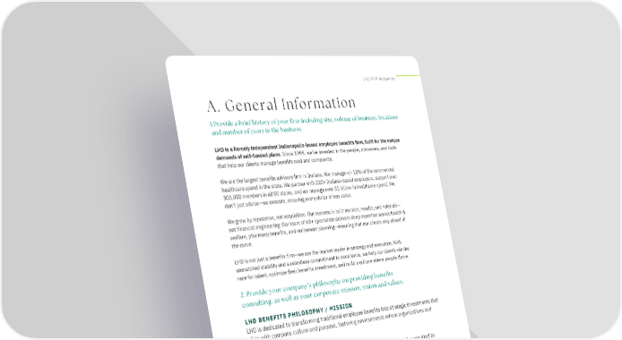 PAGE 5 LHD RFP Response A. General Information 1.Provide a brief history of your firm including size, volume of business, locations and number of years in the business. LHD is a fiercely independent Indianapolis-based employee benefits firm, built for the unique demands of self-funded plans. Since 1999, we’ve invested in the people, processes, and tools that help our clients manage benefits cost and complexity. We are the largest benefits advisory firm in Indiana. We manage +/- 10% of the commercial healthcare spend in the state. We partner with 220+ Indiana-based employers, support over 300,000 members in all 50 states, and we manage over $2 billion in healthcare spend. We don’t just advise—we execute, ensuring every dollar drives value. We grow by reputation, not acquisition. Our success is built on trust, results, and referrals— not financial engineering. Our team of 65+ specialists delivers deep expertise across health & welfare, pharmacy benefits, and retirement planning—ensuring that our clients stay ahead of the curve. LHD is not just a benefits firm—we are the market leader in strategy and execution. With unmatched stability and a relentless commitment to excellence, we help our clients win the race for talent, optimize their benefits investment, and build a culture where people thrive. 2. Provide your company’s philosophy on providing benefits consulting, as well as your corporate mission, vision and values. LHD is dedicated to transforming traditional employee benefits into strategic investments that align with company culture and purpose, fostering environments where organizations and people thrive. LHD VISION: CORPORATE CREED of a learning organization, effecting change, and committed to excellence – Steady, focused, driving, and resolute. I believe that one person can make a difference, and that a team of engaged and committed people working together can make all the difference. I embrace simplicity and commit to the spirit, patience, and discipline that this high standard demands. I exercise sound judgement, personal responsibility, and accountability. I respect myself, and the dignity of others. I stand for integrity, transparency, and mutual trust – cornerstones of trusted relationships. I welcome a diversity of people, ideas, and experiences. I serve people, within and beyond our firm – I listen, I advocate, I act. I live these values, and lead by example. I am LHD, and we are for each other. I am LHD:I am a part LHD BENEFITS PHILOSOPHY / MISSION