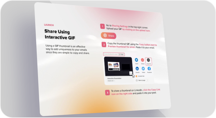 Share Using Interactive GIF LAUNCH Using a GIF thumbnail is an effective way to add uniqueness to your emails since they are simple to copy and share. 1 Go to Sharing Settings in the top right corner . Upload your GIF by clicking on the upload icon. 2 Copy the thumbnail GIF using the Copy button next to Preview thumbnail for email. Paste it to your email. 3 To share a thumbnail on LinkedIn, click the Copy Link icon on the right side and paste it into your post.