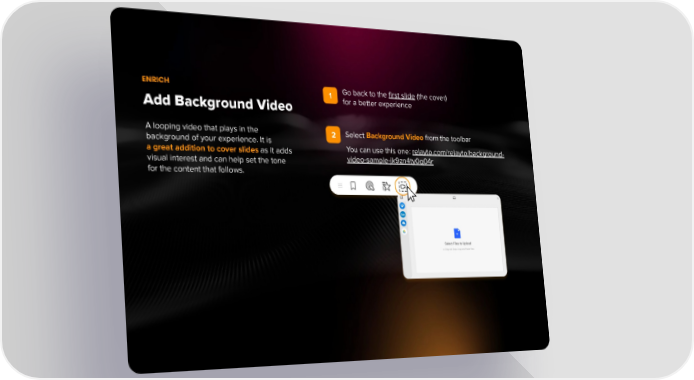 Add Background Video ENRICH A looping video that plays in the background of your experience. It is a great addition to cover slides as it adds visual interest and can help set the tone for the content that follows. Select Background Video from the toolbar You can use this one: relayto.com/relayto/background- video-sample-jk9zn4ty0q04r 2 Go back to the first slide (the cover) for a better experience 1