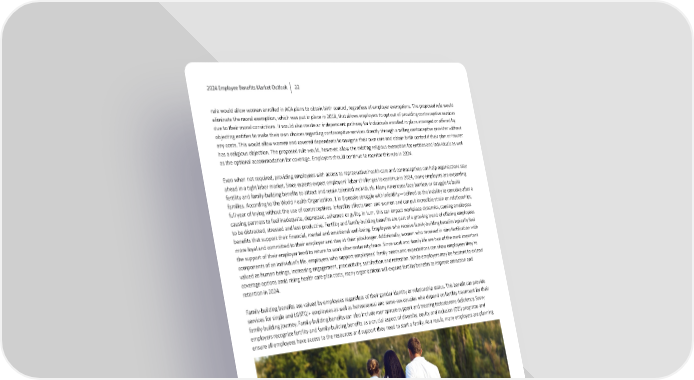 2024 Employee Benefits Market Outlook 22 rule would allow women enrolled in ACA plans to obtain birth control, regardless of employer exemp琀椀ons. The proposed rule would eliminate the moral exemp琀椀on, which was put in place in 2018, that allows employers to opt out of providing contracep琀椀ve services due to their moral convic琀椀ons. It would also create an independent pathway for individuals enrolled in plans arranged or o昀昀ered by objec琀椀ng en琀椀琀椀es to make their own choices regarding contracep琀椀ve services directly through a willing contracep琀椀ve provider without any costs. This would allow women and covered dependents to navigate their own care and obtain birth control if their plan or insurer has a religious objec琀椀on. The proposed rule would, however, allow the exis琀椀ng religious exemp琀椀on for en琀椀琀椀es and individuals as well as the op琀椀onal accommoda琀椀on for coverage. Employers should con琀椀nue to monitor this rule in 2024. Even when not required, providing employees with access to reproduc琀椀ve health care and contracep琀椀ves can help organiza琀椀ons stay ahead in a 琀椀ght labor market. Since experts expect employers’ labor challenges to con琀椀nue in 2024, many employers are expanding fer琀椀lity and family-building bene昀椀ts to a琀琀ract and retain talented individuals. Many Americans face barriers or struggle to build families. According to the World Health Organiza琀椀on, 1 in 6 people struggle with infer琀椀lity—de昀椀ned as the inability to conceive a昀琀er a full year of trying without the use of contracep琀椀ves. Infer琀椀lity a昀昀ects men and women and can put incredible strain on rela琀椀onships, causing partners to feel inadequate, depressed, ashamed or guilty. In turn, this can impact workplace dynamics, causing employees to be distracted, stressed and less produc琀椀ve. Fer琀椀lity and family-building bene昀椀ts are part of a growing trend of o昀昀ering employees bene昀椀ts that support their 昀椀nancial, mental and emo琀椀onal well-being. Employees who receive family-building bene昀椀ts typically feel more loyal and commi琀琀ed to their employer and stay at their jobs longer. Addi琀椀onally, women who received in vitro fer琀椀liza琀椀on with the support of their employer tend to return to work a昀琀er maternity leave. Since work and family life are two of the most important components of an individual’s life, employers who support employees’ family needs and expecta琀椀ons can show employees they’re valued as human beings, increasing engagement, produc琀椀vity, sa琀椀sfac琀椀on and reten琀椀on. While employers may be hesitant to extend coverage op琀椀ons amid rising health care plan costs, many organiza琀椀ons will expand fer琀椀lity bene昀椀ts to improve a琀琀rac琀椀on and reten琀椀on in 2024. Family-building bene昀椀ts are valued by employees regardless of their gender iden琀椀ty or rela琀椀onship status. This bene昀椀t can provide services for single and LGBTQI+ employees as well as heterosexual and same-sex couples who depend on fer琀椀lity treatment for their family-building journey. Family-building bene昀椀ts can also include menopause support and trea琀椀ng testosterone de昀椀ciency. Savvy employers recognize fer琀椀lity and family-building bene昀椀ts as a crucial aspect of diversity, equity and inclusion (DEI) programs and ensure all employees have access to the resources and support they need to start a family. As a result, many employers are planning to increase family health bene昀椀ts within the next few years. While these bene昀椀ts o昀琀en improve the a琀琀rac琀椀on and reten琀椀on of young genera琀椀ons of workers who are looking to start or build their families, the impact of these bene昀椀ts extends well beyond a昀昀ected individuals. Many employees want their employer to support women’s health and DEI ini琀椀a琀椀ves. Comprehensive family-building bene昀椀ts demonstrate that the organiza琀椀on cares about all its employees. In turn, when employees feel welcomed and supported in the workplace, employee engagement, produc琀椀vity and reten琀椀on are likely to increase. This can also help boost the organiza琀椀on’s employer brand to current and prospec琀椀ve employees and the public as well as improve its bo琀琀om line. While many employers are hesitant to adopt fer琀椀lity and family-building bene昀椀ts because they’re concerned with raising health care costs, research indicates that these bene昀椀ts may not be as expensive as some employers think. In fact, many organiza琀椀ons don’t experience a signi昀椀cant increase in costs when they o昀昀er fer琀椀lity coverage. O昀昀ering these bene昀椀ts can help employees access cost- e昀昀ec琀椀ve quality care and improve and boost a琀琀rac琀椀on and reten琀椀on and DEI e昀昀orts in 2024.