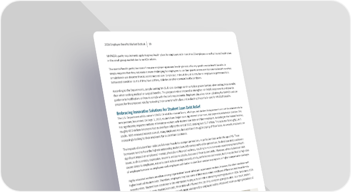 2024 Employee Benefits Market Outlook 19 MHPAEA’s parity requirements apply to group health plans for employers with more than 50 employees as well as insured health plans in the small group market due to an ACA reform. The mental health parity law doesn’t require employer-sponsored health plans to o昀昀er any speci昀椀c mental health bene昀椀ts. It simply requires that they not make it more challenging for employees to use their plan to access care for a mental health condi琀椀on or substance use disorder than to access medical care. Simply put, it should be just as easy for an employee to get treated for a behavioral condi琀椀on as it is if they have asthma, diabetes or other common health condi琀椀ons. According to the Departments, people seeking MH/SUD care coverage con琀椀nue to face greater barriers when seeking these bene昀椀ts than when seeking medical or surgical bene昀椀ts. The proposed rule is intended to strengthen MHPAEA’s requirements and provide guidance to health plans on how to comply with the law’s requirements. Employers play a key role in upholding the MHPAEA and can prepare for the proposed rule by reviewing their current health plans and evalua琀椀ng the parity in care for MH/SUD bene昀椀ts. Embracing Innovative Solutions for Student Loan Debt Relief The U.S. Department of Educa琀椀on’s COVID-19 relief for student loans, which paused student loan payments and set the interest rate to zero percent, has ended. On Sept. 1, 2023, student loans began accruing interest once more, and payments restarted in October. This has signi昀椀cantly impacted millions of American workers with student loan debt and their employers. According to the Federal Reserve, roughly 43.5 million Americans had student loan debt at the end of 2022, totaling over $1.7 trillion. This accounts for roughly 1 in 5 adults. With renewed interest accrual, many employees may face addi琀椀onal struggles paying o昀昀 their loans. As a result, employees are increasingly looking to their employers for student loan assistance. The impacts of student loan debt are felt most heavily by younger genera琀椀ons, in par琀椀cular those under the age of 40. These borrowers tend to have the highest outstanding student loan debt compared to older genera琀椀ons. Student loan debts can have a signi昀椀cant impact on employees’ mental, physical and 昀椀nancial wellness, resul琀椀ng in many borrowers experiencing mental health issues, such as anxiety, depression, insomnia and panic a琀琀acks, because of their student debt. Moreover, when student loan debt causes stress to employees, not only can it reduce workplace produc琀椀vity, performance and morale, but it may also lead to high rates of employee turnover as employees seek employers with be琀琀er student loan assistance programs or higher compensa琀椀on packages. Highly educated workers are o昀琀en among organiza琀椀ons’ most skilled and experienced workers; however, this o昀琀en correlates with higher levels of student debt. Therefore, employers may lose some of their most valued employees if these workers leave for new opportuni琀椀es. Student loan assistance is also an琀椀cipated to play a crucial role in a琀琀rac琀椀ng recent graduates in 2024. Since many 2024 graduates expect to carry student loan debt, their debt will in昀氀uence the jobs they consider upon gradua琀椀on. As a result, student debt relief programs will likely become increasingly more widespread as employers look to a琀琀ract and retain younger genera琀椀ons of workers in 2024 and beyond.
