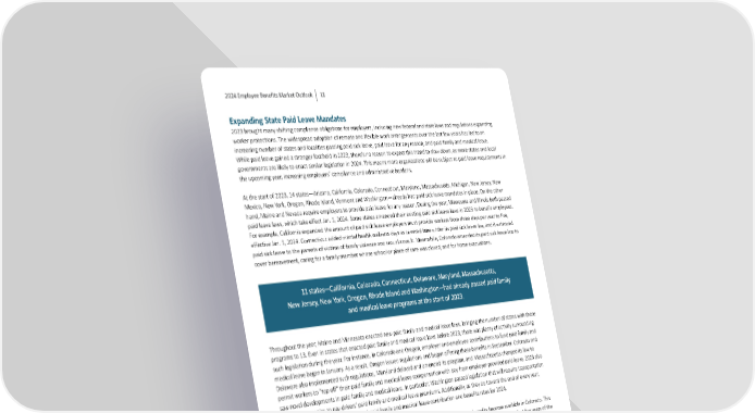2024 Employee Benefits Market Outlook 11 Expanding State Paid Leave Mandates 2023 brought many shi昀琀ing compliance obliga琀椀ons for employers, including new federal and state laws and regula琀椀ons expanding worker protec琀椀ons. The widespread adop琀椀on of remote and 昀氀exible work arrangements over the last few years has led to an increasing number of states and locali琀椀es passing paid sick leave, paid leave for any reason, and paid family and medical leave. While paid leave gained a stronger foothold in 2023, there’s no reason to expect this trend to slow down, as more states and local governments are likely to enact similar legisla琀椀on in 2024. This means more organiza琀椀ons will be subject to paid leave requirements in the upcoming year, increasing employers’ compliance and administra琀椀ve burdens. At the start of 2023, 14 states—Arizona, California, Colorado, Connec琀椀cut, Maryland, Massachuse琀琀s, Michigan, New Jersey, New Mexico, New York, Oregon, Rhode Island, Vermont and Washington—already had paid sick leave mandates in place. On the other hand, Maine and Nevada require employers to provide paid leave for any reason. During the year, Minnesota and Illinois both passed paid leave laws, which take e昀昀ect Jan. 1, 2024. Some states amended their exis琀椀ng paid sick leave laws in 2023 to bene昀椀t employees. For example, California expanded the amount of paid sick leave employers must provide workers from three days per year to 昀椀ve, e昀昀ec琀椀ve Jan. 1, 2024. Connec琀椀cut added mental health wellness days as covered 琀椀me under its paid sick leave law, and it extended paid sick leave to the parents of vic琀椀ms of family violence and sexual assault. Meanwhile, Colorado amended its paid sick leave law to cover bereavement, caring for a family member whose school or place of care was closed, and for home evacua琀椀ons. 11 states—California, Colorado, Connecticut, Delaware, Maryland, Massachusetts, New Jersey, New York, Oregon, Rhode Island and Washington—had already passed paid family and medical leave programs at the start of 2023. Throughout the year, Maine and Minnesota enacted new paid family and medical leave laws, bringing the number of states with these programs to 13. Even in states that enacted paid family and medical leave laws before 2023, there was plenty of ac琀椀vity surrounding such legisla琀椀on during the year. For instance, in Colorado and Oregon, employer and employee contribu琀椀ons to fund paid family and medical leave began in January. As a result, Oregon issued regula琀椀ons and began o昀昀ering these bene昀椀ts in September. Colorado and Delaware also implemented such regula琀椀ons, Maryland delayed and amended its program, and Massachuse琀琀s changed its law to permit workers to “top o昀昀” their paid family and medical leave compensa琀椀on with pay from employer-provided paid leave. 2023 also saw novel developments in paid family and medical leave. In par琀椀cular, Washington passed legisla琀椀on that will require transporta琀椀on network companies to pay drivers’ paid family and medical leave premiums. Addi琀椀onally, as they do toward the end of every year, states began announcing their updated paid family and medical leave contribu琀椀on and bene昀椀ts rates for 2024. Looking forward to 2024 and beyond, Jan. 1 marks the date paid family and medical leave bene昀椀ts become available in Colorado. This is also the deadline for small employers in Delaware to elect to reduce employees’ parental leave by 50% (for the 昀椀rst 昀椀ve years of the program) and for employers to apply for 昀椀ve-year grandfathering of exis琀椀ng plans. The state’s paid family and medical leave bene昀椀ts will start on Jan. 1, 2026. Maryland delayed the start of its program so that contribu琀椀ons will begin Oct. 1, 2024, with bene昀椀ts star琀椀ng Jan. 1, 2026. Family, private and nonstate public employers will be able to buy coverage for Vermont’s voluntary program star琀椀ng July 1, 2024. Insurance becomes available for purchase by individual workers and employers with only one employee in 2025. In 2024, employers not subject to state or local paid sick leave requirements should be a琀琀uned to legisla琀椀ve momentum on this topic in loca琀椀ons where they operate, as it’s likely that more areas will pass paid leave mandates. Employers already subject to paid sick leave laws should stay alert to amendments that would expand such leave, especially for reasons related to reproduc琀椀ve loss, bereavement, organ dona琀椀on and public health emergencies, all areas in which states have increasingly granted leave en琀椀tlements in recent years.