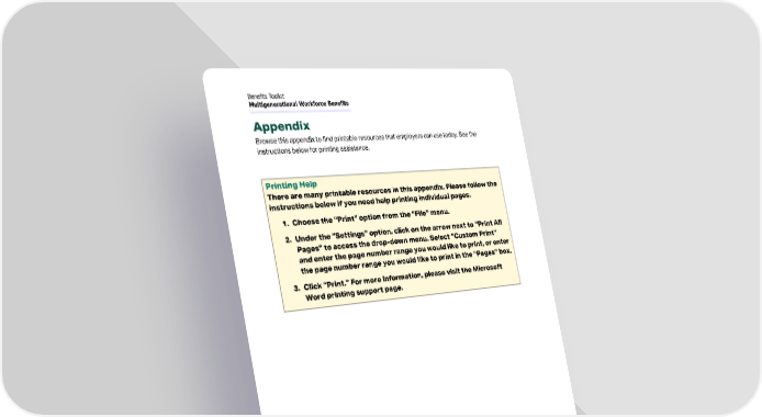Appendix Browse this appendix to find printable resources that employers can use today. See the instructions below for printing assistance. Printing Help There are many printable resources in this appendix. Please follow the instructions below if you need help printing individual pages. 1. Choose the “Print” option from the “File” menu. 2. Under the “Settings” option, click on the arrow next to “Print All Pages” to access the drop-down menu. Select “Custom Print” and enter the page number range you would like to print, or enter the page number range you would like to print in the “Pages” box. 3. Click “Print.” For more information, please visit the Microsoft Word printing support page. 13