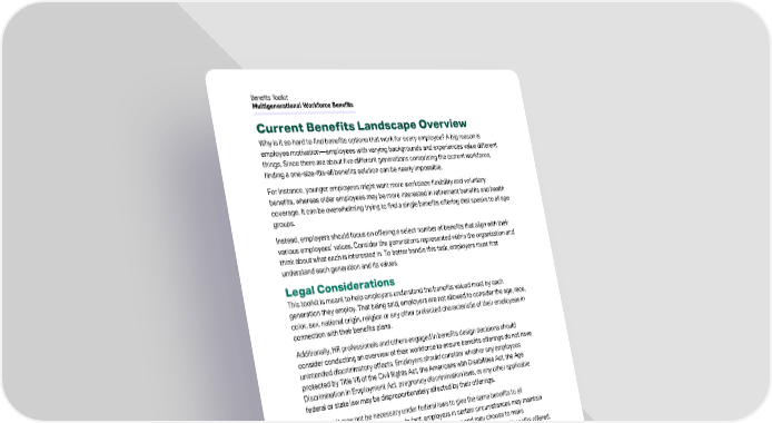 Current Benefits Landscape Overview Why is it so hard to find benefits options that work for every employee? A big reason is employee motivation—employees with varying backgrounds and experiences value different things. Since there are about five different generations comprising the current workforce, finding a one-size-fits-all benefits solution can be nearly impossible. For instance, younger employees might want more workplace flexibility and voluntary benefits, whereas older employees may be more interested in retirement benefits and health coverage. It can be overwhelming trying to find a single benefits offering that speaks to all age groups. Instead, employers should focus on offering a select number of benefits that align with their various employees’ values. Consider the generations represented within the organization and think about what each is interested in. To better handle this task, employers must first understand each generation and its values. Legal Considerations This toolkit is meant to help employers understand the benefits valued most by each generation they employ. That being said, employers are not allowed to consider the age, race, color, sex, national origin, religion or any other protected characteristic of their employees in connection with their benefits plans. Additionally, HR professionals and others engaged in benefits design decisions should consider conducting an overview of their workforce to ensure benefits offerings do not have unintended discriminatory effects. Employers should consider whether any employees protected by Title VII of the Civil Rights Act, the Americans with Disabilities Act, the Age Discrimination in Employment Act, pregnancy discrimination laws, or any other applicable federal or state law may be disproportionately affected by their offerings. Note that it may not be necessary under federal laws to give the same benefits to all employees in every circumstance. In fact, employers in certain circumstances may maintain some discretion when structuring their benefits offerings and may choose to make distinctions among employee segments regarding access to and the level of benefits offered, so long as the distinction has no unintended discriminatory effect and is not made based on a protected characteristic. For example, some employers offer tiered benefits packages that are connected to an employee’s length of service or geographic location without being overtly tied to age, but employers must consult with legal counsel before pursuing such options. Be sure to exercise due diligence to ensure your organization’s benefits offerings are not discriminatory. 4