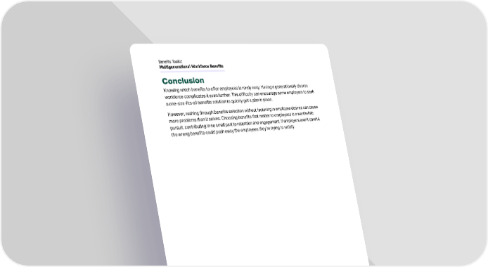 Conclusion Knowing which benefits to offer employees is rarely easy. Having a generationally diverse workforce complicates it even further. This difficulty can encourage some employers to seek a one-size-fits-all benefits solution to quickly get a plan in place. However, rushing through benefits selection without factoring in employee desires can cause more problems than it solves. Choosing benefits that matter to employees is a worthwhile pursuit, contributing in no small part to retention and engagement. If employers aren’t careful, the wrong benefits could push away the employees they’re trying to satisfy. 12