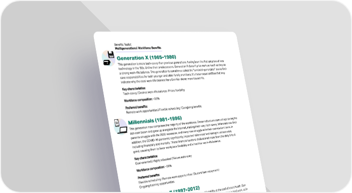 Generation X (1965-1980) This generation is more tech-savvy than previous generations, having been the first adopters of new technology in the ‘90s. Unlike their predecessors, Generation X doesn’t prize work as much as they do a strong work-life balance. This generation is sometimes called the “sandwich generation” due to their care responsibilities for both younger and older family members. It’s these responsibilities that may indicate why the ideal work-life balance for a Gen Xer skews more toward life. Key characteristics: Tech-savvy | Desires work-life balance | Prizes flexibility Workforce composition: ~35% Preferred benefits: Remote work opportunities | Flexible scheduling | Caregiving benefits Millennials (1981-1996) This generation now comprises the majority of the workforce. These individuals came of age during the dot-com boom and grew up alongside the internet, making them very tech-savvy. Millennials saw their parents struggle with the 2008 recession, and many now struggle with their own student loans. In addition, the COVID-19 pandemic significantly impacted millennials’ well-being in various ways, including financially and mentally. These financial burdens disillusioned many from the daily 9-to-5 grind, causing them to favor workplace flexibility and a healthier work-life balance. Key characteristics: Goal-oriented | Highly educated | Values autonomy Workforce composition: ~39% Preferred benefits: Flexible scheduling | Remote work opportunities | Student loan repayment | Ongoing training opportunities Generation Z (1997-2012) This generation, like millennials, is concerned with financial stability at the cost of one’s health. Gen Zers have seen previous generations struggle to make ends meet despite putting in hard work, as in the cases of outrageous student loans and financial recessions. This makes Generation Z more well- being-oriented than other generations, expecting mental health and similar workplace benefits to offset workplace stressors. Additionally, this generation never knew life before the internet, making them quick learners when it comes to technology. Key characteristics: Well-being-oriented | Entrepreneurial | Fast learners Workforce composition: ~6% Preferred benefits: Flexible scheduling | Remote work opportunities | Comprehensive employee assistance program benefits 6