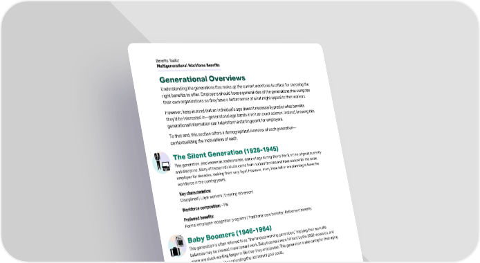 Generational Overviews Understanding the generations that make up the current workforce is critical for choosing the right benefits to offer. Employers should have a general idea of the generations that comprise their own organizations so they have a better sense of what might appeal to their workers. However, keep in mind that an individual’s age doesn’t necessarily predict what benefits they’d be interested in—generational age bands aren’t an exact science. Instead, knowing this generational information can help inform a starting point for employers. To that end, this section offers a demographical overview of each generation— contextualizing the motivations of each. The Silent Generation (1928-1945) This generation, also known as traditionalists, came of age during World War II, a time of great austerity and discipline. Many of these individuals come from nuclear families and have worked for the same employer for decades, making them very loyal. However, many have left or are planning to leave the workforce in the coming years. Key characteristics: Disciplined | Loyal workers | Entering retirement Workforce composition: ~1% Preferred benefits: Formal employee recognition programs | Traditional core benefits | Retirement benefits Baby Boomers (1946-1964) This generation is often referred to as “the hardest-working generation,” implying their work-life balances may be skewed more toward work. Baby boomers were hit hard by the 2008 recession, and many are stuck working longer in life than they anticipated. This generation is also caring for their aging family members, further extending the retirement goal posts. Key characteristics: Strong work ethic | Experienced| Eyeing retirement Workforce composition: ~19% Preferred benefits: Caregiving benefits | Comprehensive health care plans | Workplace flexibility | Retirement benefits | Ongoing training opportunities 5