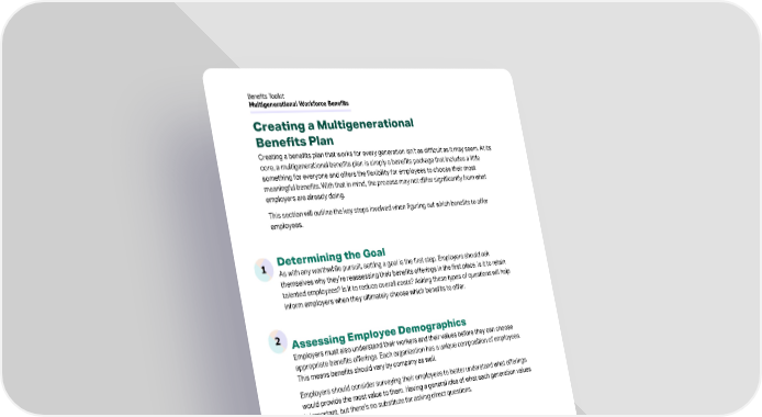 Creating a Multigenerational Benefits Plan Creating a benefits plan that works for every generation isn’t as difficult as it may seem. At its core, a multigenerational benefits plan is simply a benefits package that includes a little something for everyone and offers the flexibility for employees to choose their most meaningful benefits. With that in mind, the process may not differ significantly from what employers are already doing. This section will outline the key steps involved when figuring out which benefits to offer employees. 1 Determining the Goal As with any worthwhile pursuit, setting a goal is the first step. Employers should ask themselves why they’re reassessing their benefits offerings in the first place. Is it to retain talented employees? Is it to reduce overall costs? Asking these types of questions will help inform employers when they ultimately choose which benefits to offer. 2 Assessing Employee Demographics Employers must also understand their workers and their values before they can choose appropriate benefits offerings. Each organization has a unique composition of employees. This means benefits should vary by company as well. Employers should consider surveying their employees to better understand what offerings would provide the most value to them. Having a general idea of what each generation values is important, but there’s no substitute for asking direct questions. 3 Deciding on a Budget Learning which benefits employees value will allow employers to move onto the nitty-gritty: creating a budget. While every employer wants to offer their workers the best of everything, that’s not usually a viable option. Once an employer develops a sense of what benefits their employees would prefer, they can move onto pricing those benefits. This might force employers to make hard decisions, having to choose between the most desired options and the most cost-effective ones. 10